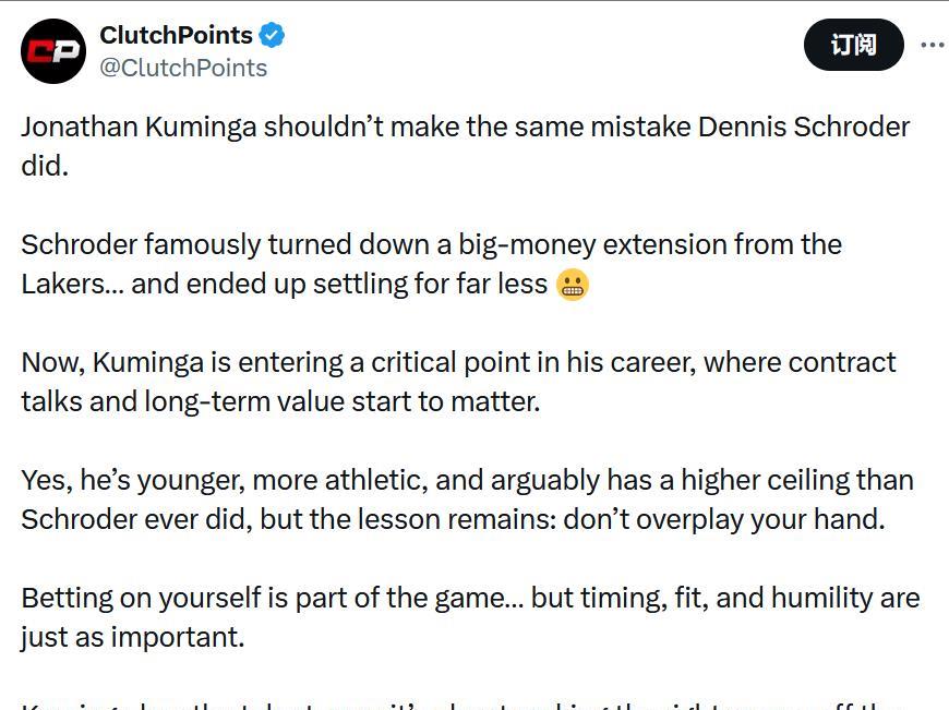 是的,他比施罗德更年轻、运动能力更强,可以说上限也高于施罗德,但这个教训依然适用:不要高估自己手上的筹码。在职业生涯中“押注自己”是比赛的一部分……但时机、契合度和谦逊同样重要。库明加天赋卓绝,而现在场下的正确抉择同样关键。