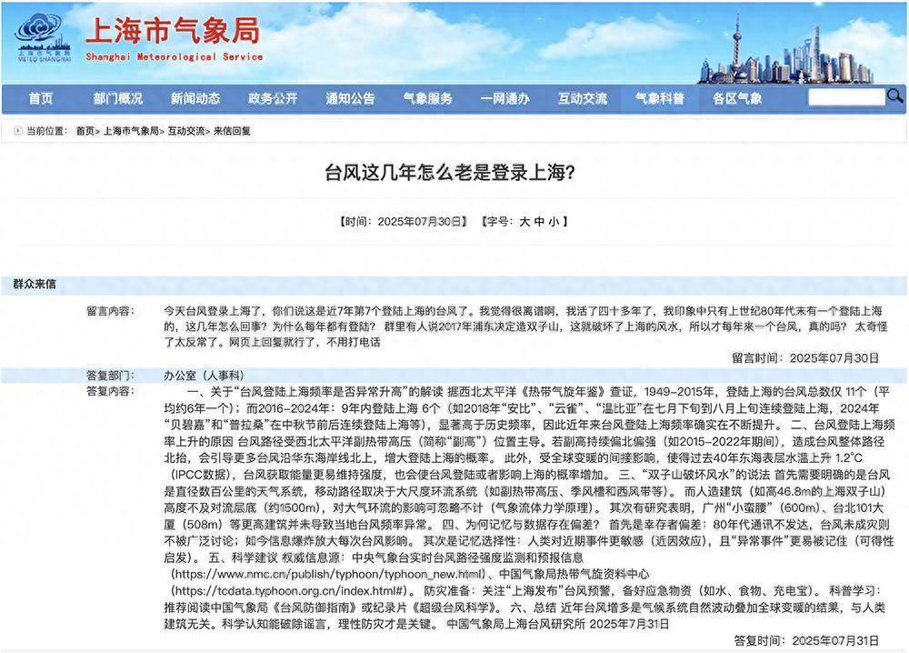 “近年台风增多是气候系统自然波动叠加全球变暖的结果,与人类建筑无关。科学认知能破除谣言,理性防灾才是关键。”中国气象局上海台风研究所在答复中表示。