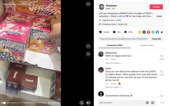 在TikTok上,开箱名创优品盲盒的视频开始流行。比如一位博主拍200美元预算逛名创优品的视频,获得了几十万互动。有人不了解名创优品时,博主还解释称:名创优品拥有自己的IP,同时也代理其他IP,类似于泡泡玛特。